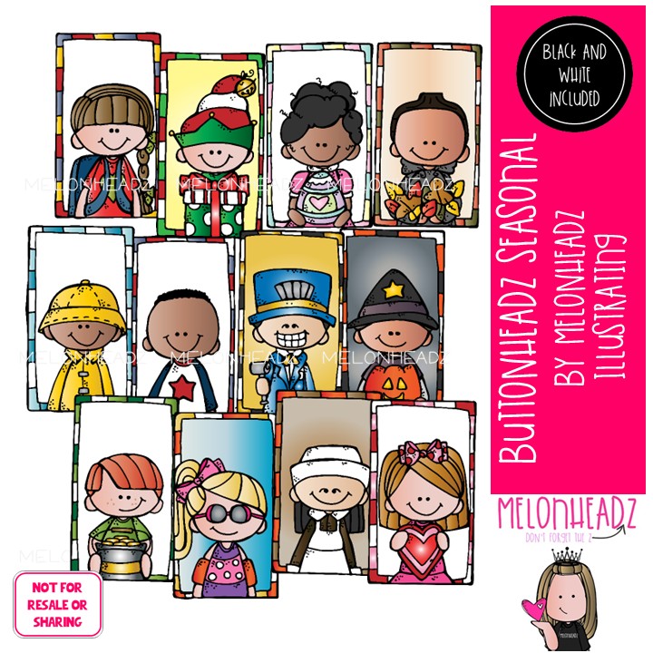 Buttonheadz clip art, seasonal, hoilday, tag COMBO PACK: This illustrated set contains all of the clip art images as shown in the preview picture. COLORED and BLACK AND WHITE illustrations included.