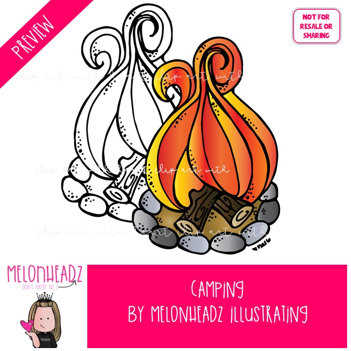 Camping clip art, trailer, fire COMBO PACK: This illustrated set contains all of the clip art images as shown in the preview picture. COLORED and BLACK AND WHITE illustrations included.