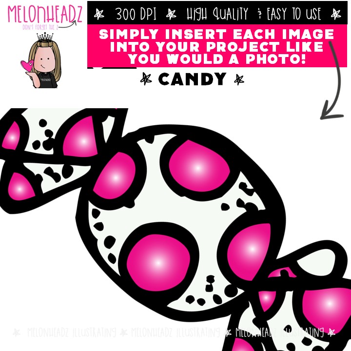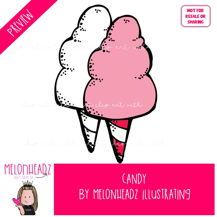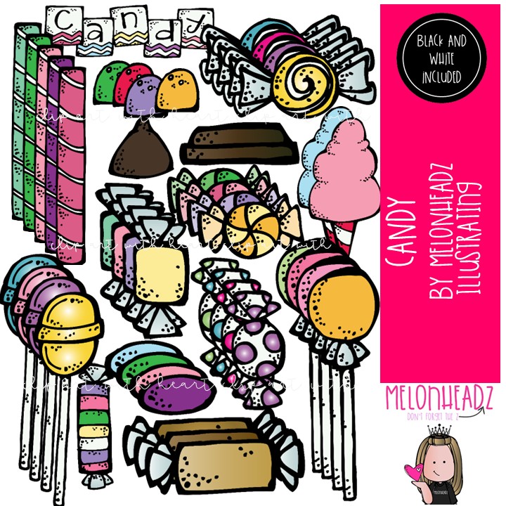 Candy clip art, treat, cotton candy COMBO PACK: This illustrated set contains all of the clip art images as shown in the preview picture. COLORED and BLACK AND WHITE illustrations included.