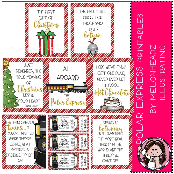 Posters - Includes "All Aboard", " The bell still rings", "First gift of Christmas", "Hot Chocolate", "Seeing is Believing", "True meaning of Christmas", "The thing about Trains", and 3 train tickets ready to print on one page! Packaged in a PDF file, designed on a 8.5x11" paper.