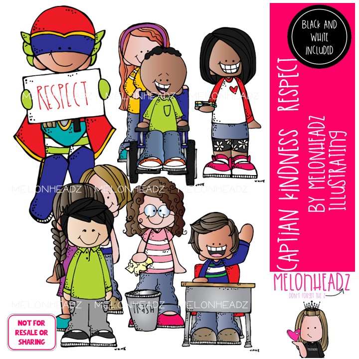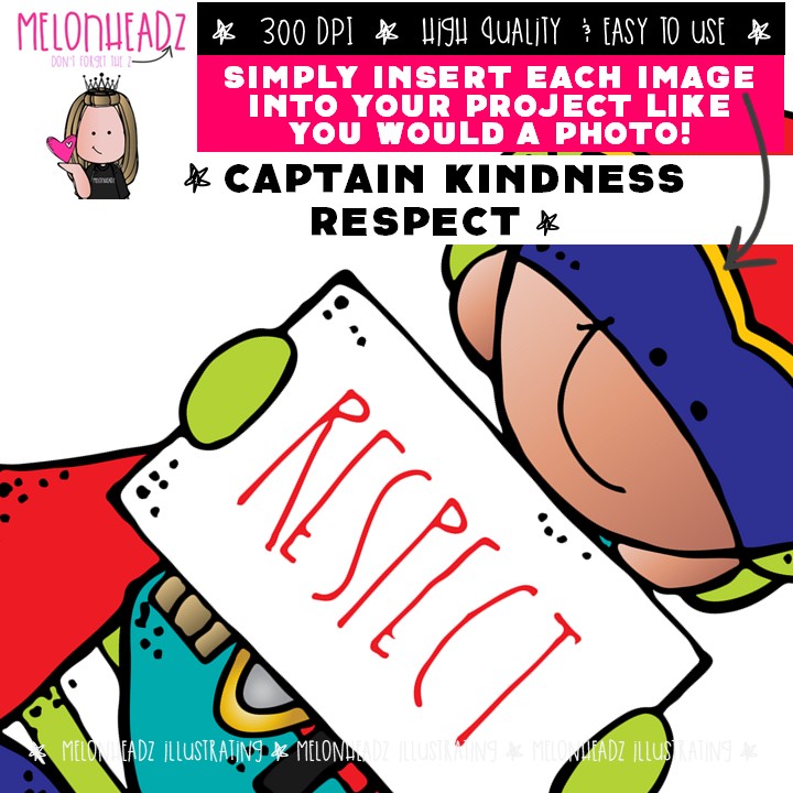 Captain Kindness clip art, Respect, Manners, superhero Mini: This illustrated set contains all of the clip art images as shown in the preview picture. COLORED and BLACK AND WHITE illustrations included.