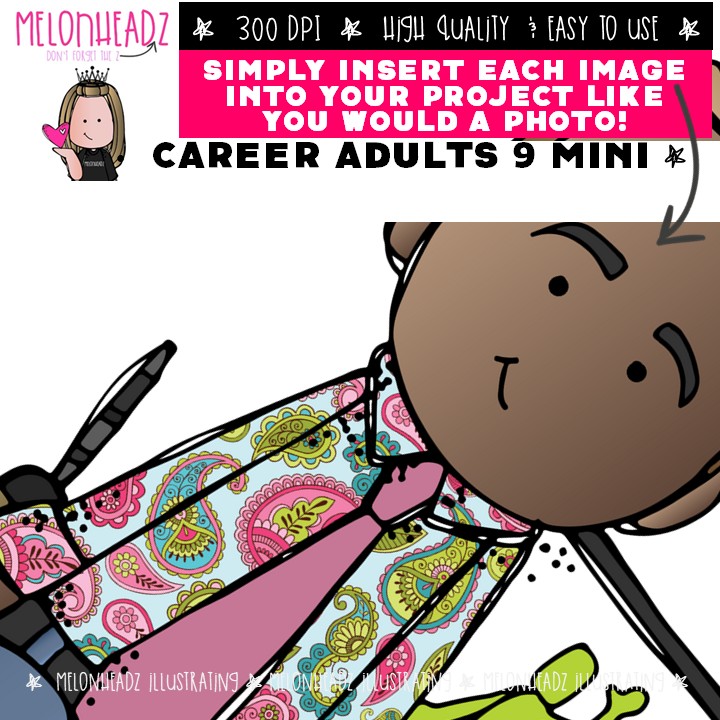 Career 9 clip art, Adults, occupation, job Mini: This illustrated set contains all of the clip art images as shown in the preview picture. COLORED and BLACK AND WHITE illustrations included.