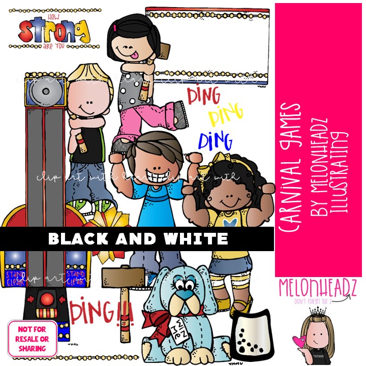 Carnival Game clip art, outdoor, activity BLACK AND WHITE: This illustrated set contains all of the clip art images as shown in the preview picture. BLACK AND WHITE illustrations included.