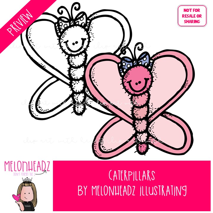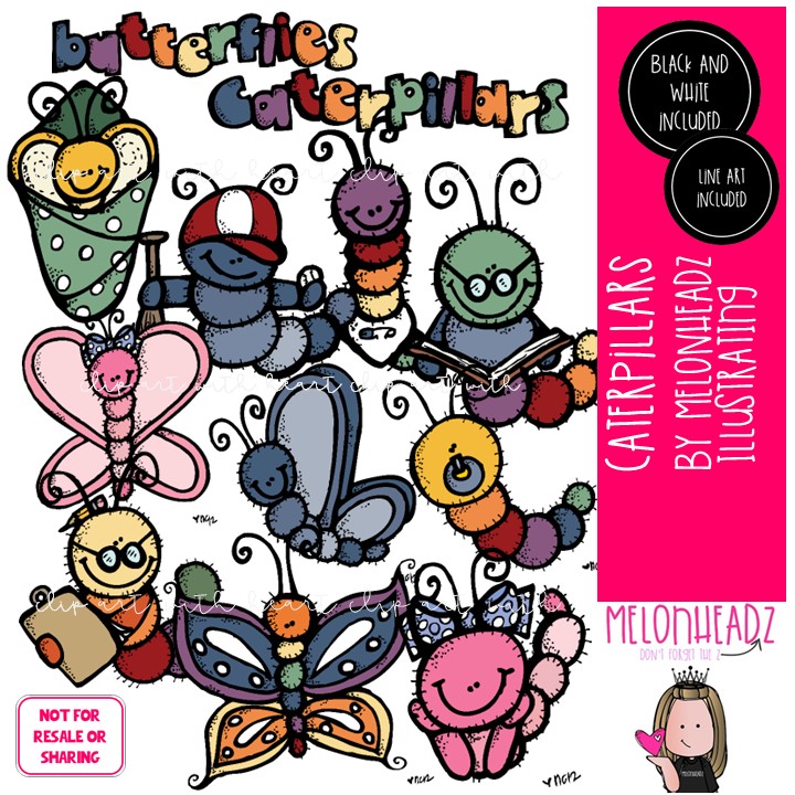Caterpillar clip art, butterfly, bug COMBO PACK: This illustrated set contains all of the clip art images as shown in the preview picture. COLORED, BLACK AND WHITE and LINE ART illustrations included.