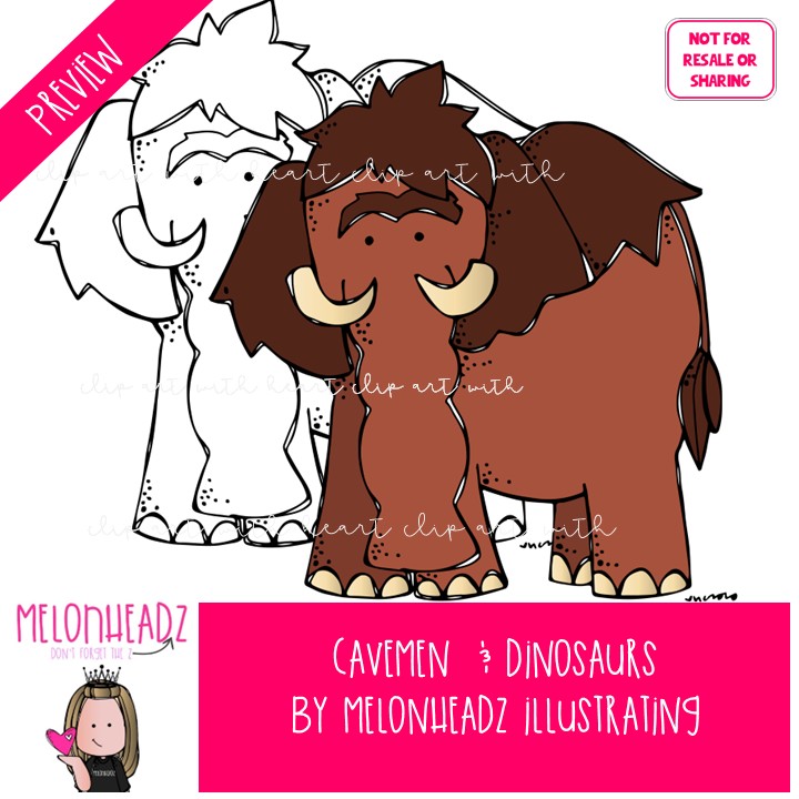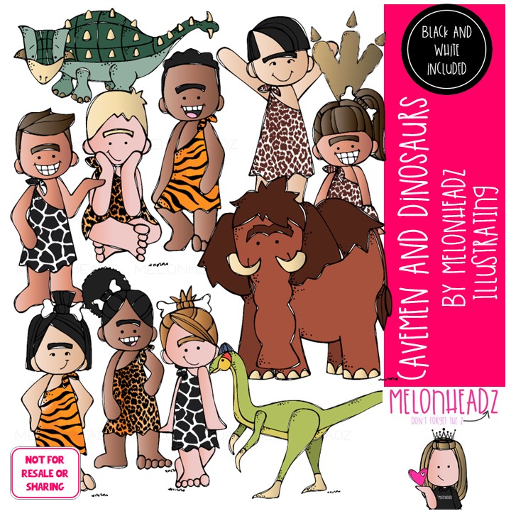 Cavemen and dinosaur clip art, prehistoric, mastodon COMBO PACK: This illustrated set contains all of the clip art images as shown in the preview picture. COLORED and BLACK AND WHITE illustrations included.