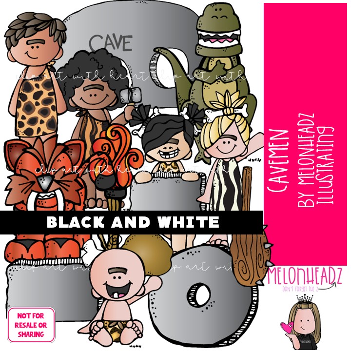 Cavemen clip art, prehistoric, dinosaur BLACK AND WHITE: This illustrated set contains all of the clip art images as shown in the preview picture. BLACK AND WHITE illustrations included.