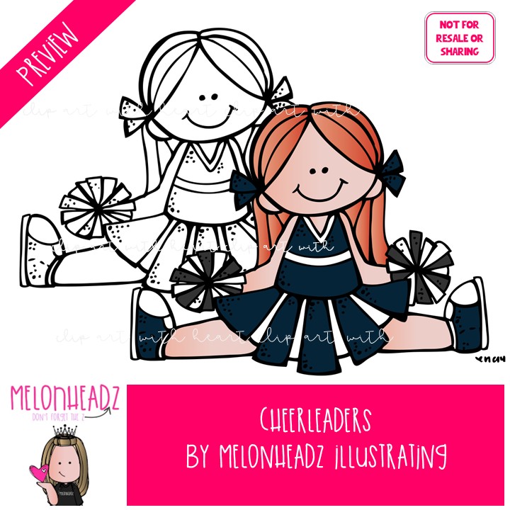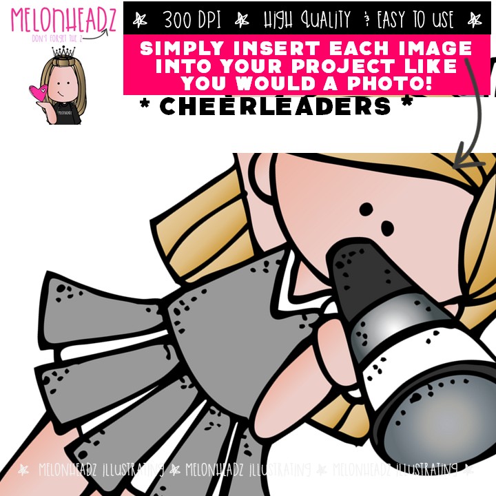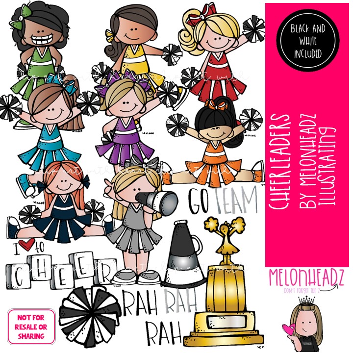 Cheerleaders clip art, sport, school spirit COMBO PACK: This illustrated set contains all of the clip art images as shown in the preview picture. COLORED and BLACK AND WHITE illustrations included.