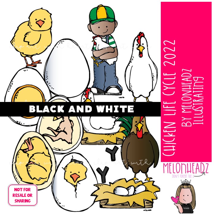 Chicken Life Cycle clip art 2022, egg, sequence BLACK AND WHITE: This illustrated set contains all of the clip art images as shown in the preview picture. BLACK AND WHITE illustrations included.