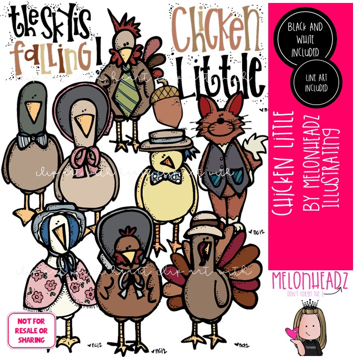 Chicken Little clip art, book companion, literature COMBO PACK: This illustrated set contains all of the clip art images as shown in the preview picture. COLORED, BLACK AND WHITE and LINE ART illustrations included.