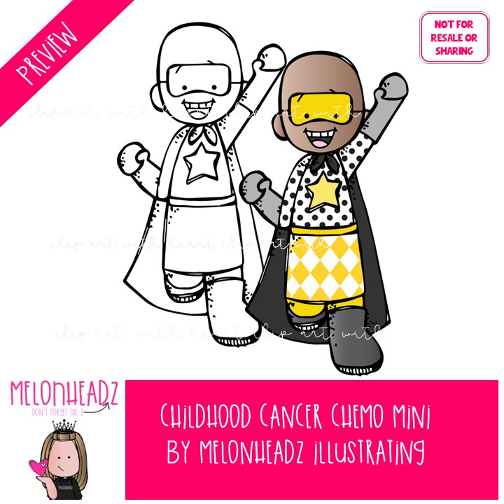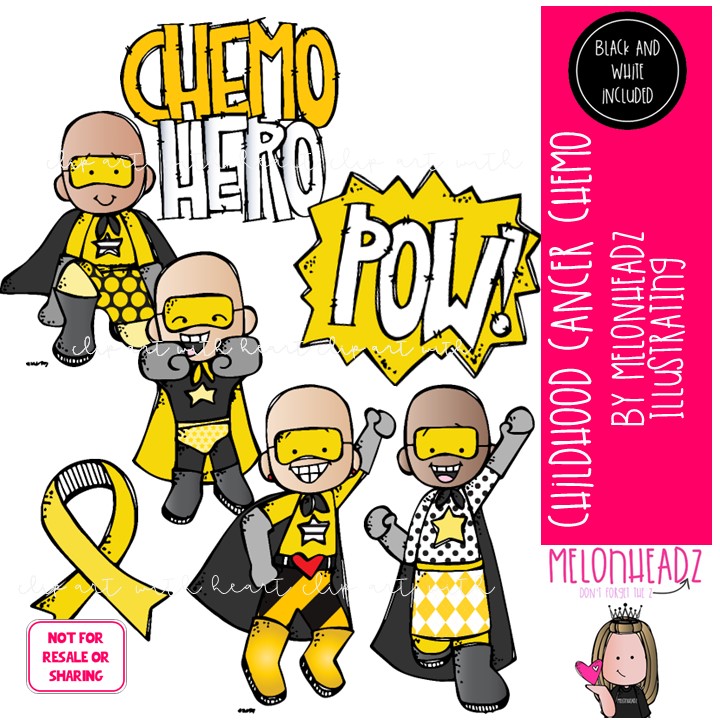 Childhood Cancer Chemo clip art, ribbon, superhero: This illustrated set contains all of the clip art images as shown in the preview picture. COLORED and BLACK AND WHITE illustrations included.