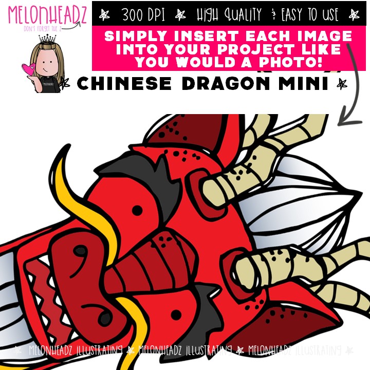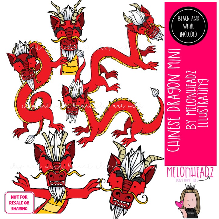 Chinese Dragon clip art, Lunar New Year Mini: This illustrated set contains all of the clip art images as shown in the preview picture. COLORED and BLACK AND WHITE illustrations included.