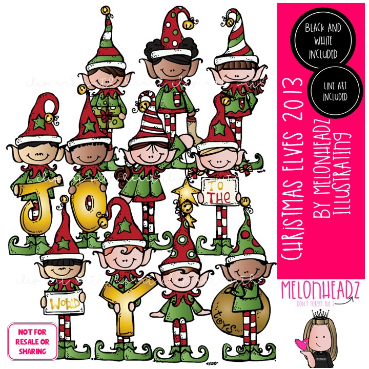 Christmas Elves clip art 2013 COMBO PACK: This illustrated set contains all of the clip art images as shown in the preview picture. COLORED, BLACK AND WHITE and LINE ART illustrations included.