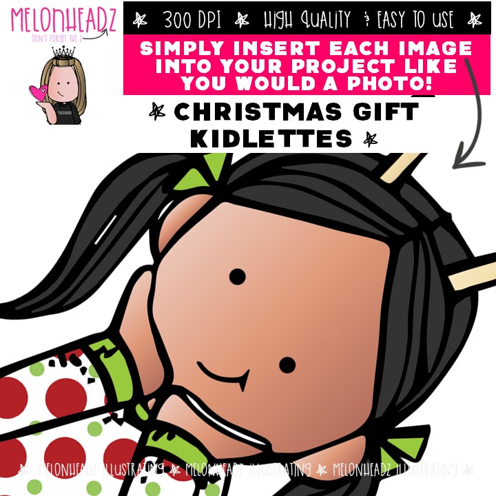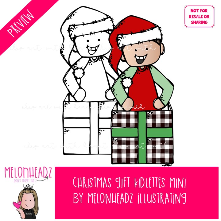 Christmas Gift Kidlettes clip art, Present clip art Mini: This illustrated set contains all of the clip art images as shown in the preview picture. COLORED and BLACK AND WHITE illustrations included.