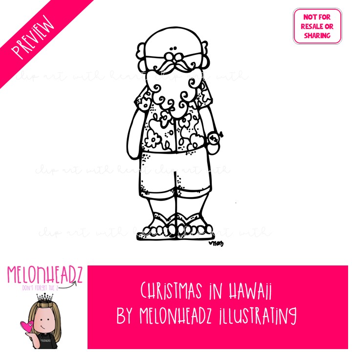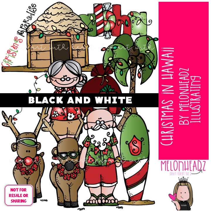 Christmas in Hawaii clip art, Warm weather, Santa BLACK AND WHITE: This illustrated set contains all of the clip art images as shown in the preview picture. BLACK AND WHITE illustrations included.