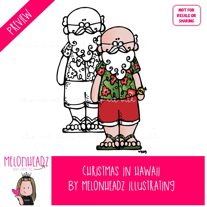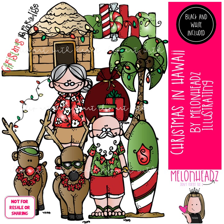 Christmas in Hawaii clip art, Warm Weather, Santa COMBO PACK: This illustrated set contains all of the clip art images as shown in the preview picture. COLORED and BLACK AND WHITE illustrations included.