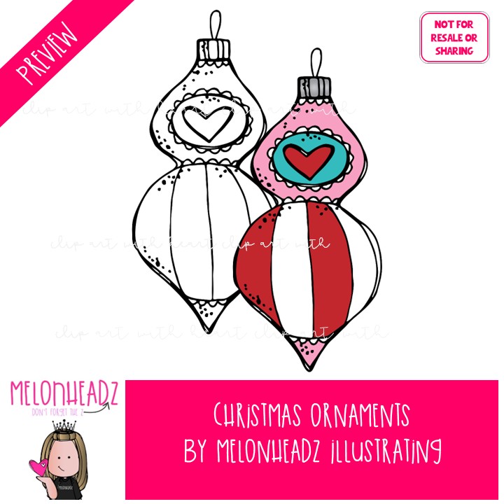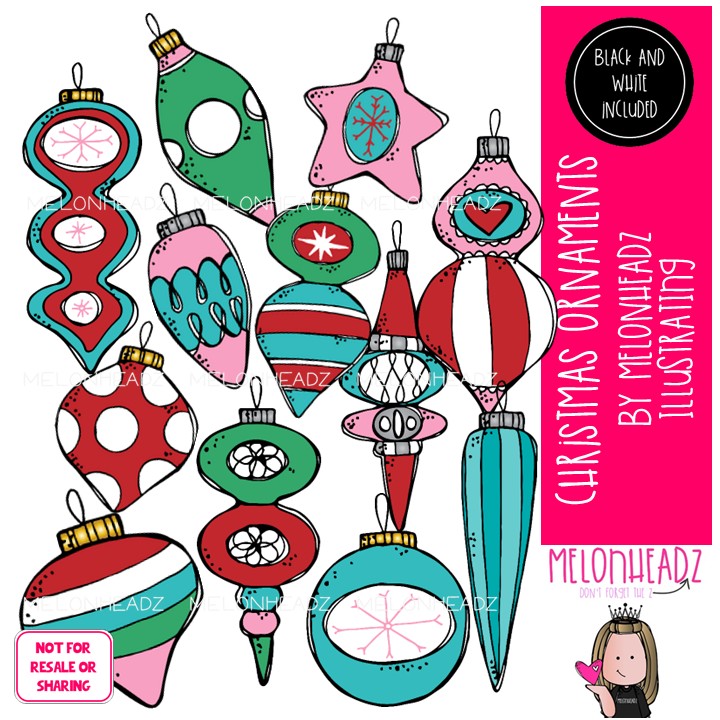 Christmas Ornament clip art COMBO PACK: This illustrated set contains all of the clip art images as shown in the preview picture. COLORED and BLACK AND WHITE illustrations included.