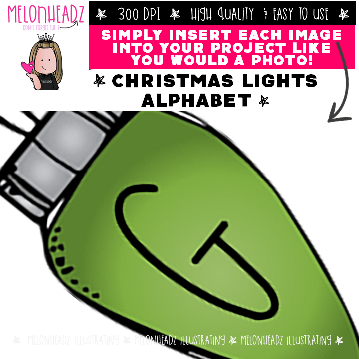 Christmas light alphabet COLORED Version: This illustrated set contains all of the clip art images as shown in the preview picture. COLORED illustrations included.