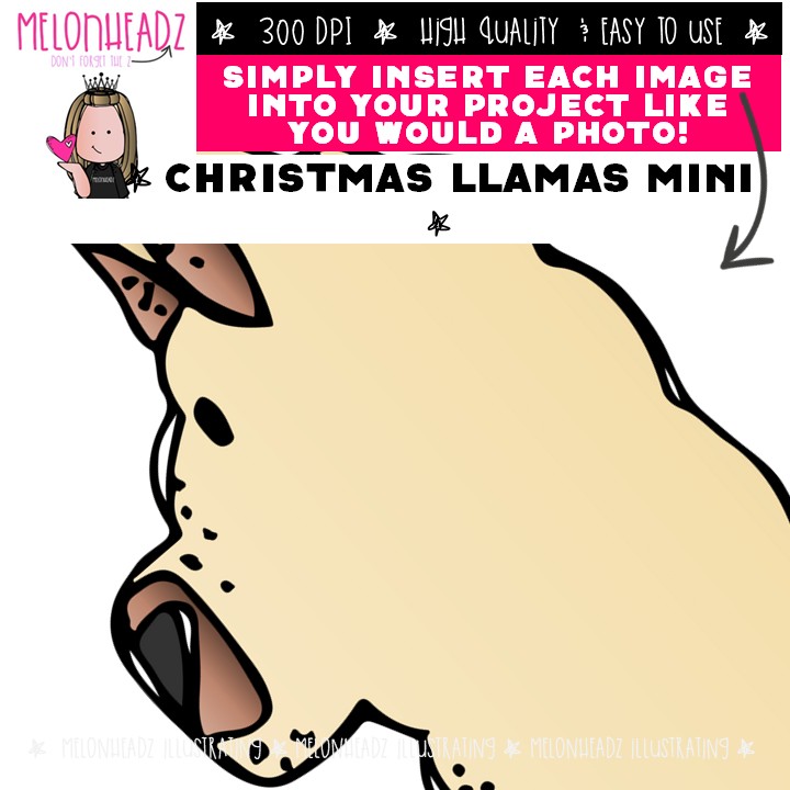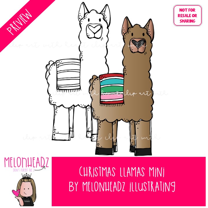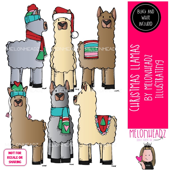 Christmas Llamas clip art, Alpaca clip art Mini: This illustrated set contains all of the clip art images as shown in the preview picture. COLORED and BLACK AND WHITE illustrations included.