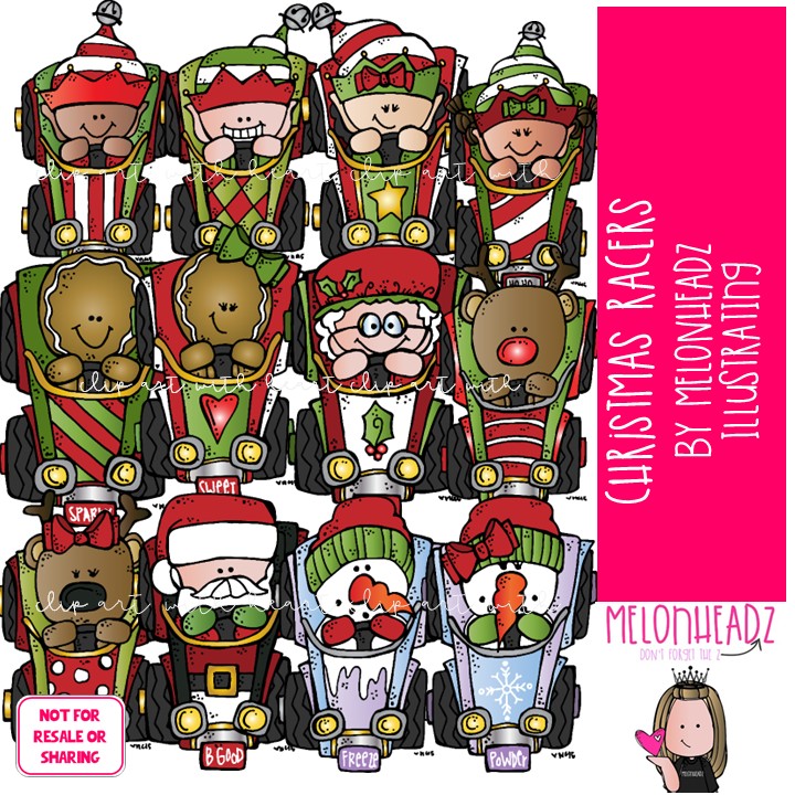Christmas Racers clip art, Race car clip art, Santa clip art COLORED Version: This illustrated set contains all of the clip art images as shown in the preview picture. COLORED illustrations included.