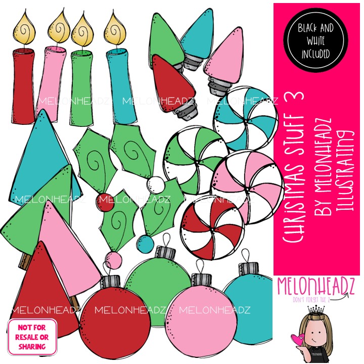 Christmas Stuff clip art Set 3, Ornament clip art COMBO PACK: This illustrated set contains all of the clip art images as shown in the preview picture. COLORED and BLACK AND WHITE illustrations included.