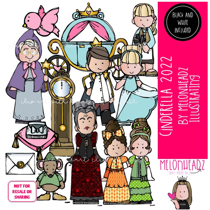 Cinderella clip art 2022, princess, literature, book companion COMBO PACK: This illustrated set contains all of the clip art images as shown in the preview picture. COLORED and BLACK AND WHITE illustrations included.