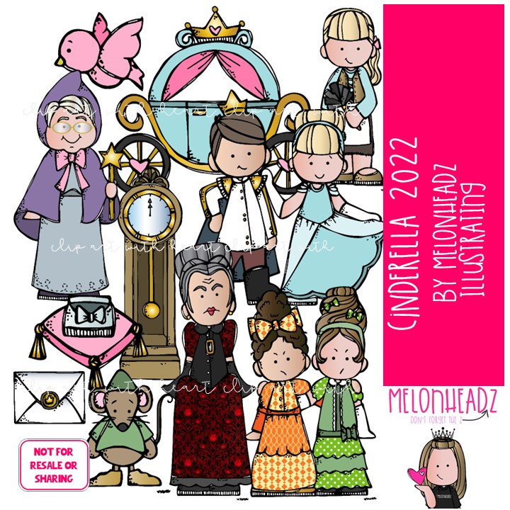 Cinderella clip art 2022, princess, literature, book companion COLORED Version: This illustrated set contains all of the clip art images as shown in the preview picture. COLORED illustrations included.