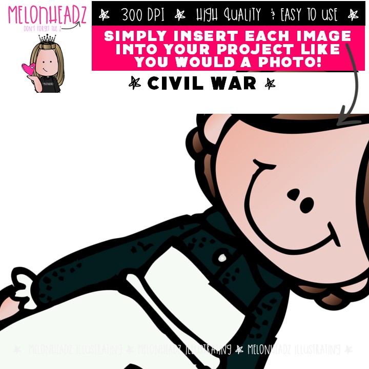Civil War clip art, Confederate, Union COMBO PACK: This illustrated set contains all of the clip art images as shown in the preview picture. COLORED, BLACK AND WHITE and LINE ART illustrations included.