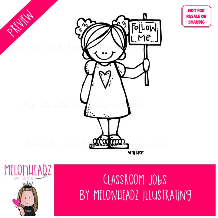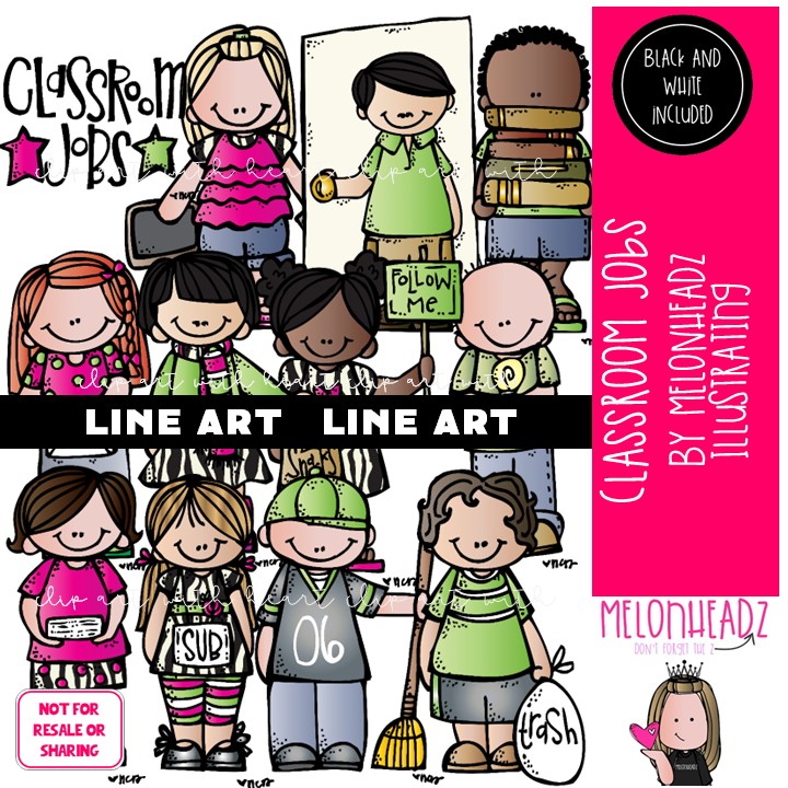 Classroom Jobs clip art, school, kidlettes LINE ART and BLACK AND WHITE: This illustrated set contains all of the clip art images as shown in the preview picture. LINE ART and BLACK AND WHITE illustrations included.