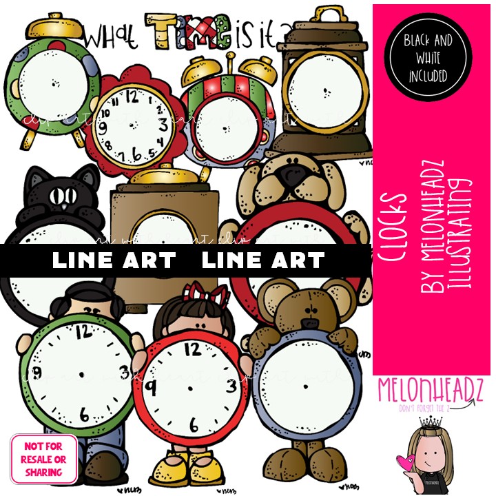 Clocks clip art, blank, time, LINE ART and BLACK AND WHITE: This illustrated set contains all of the clip art images as shown in the preview picture. LINE ART and BLACK AND WHITE illustrations included.