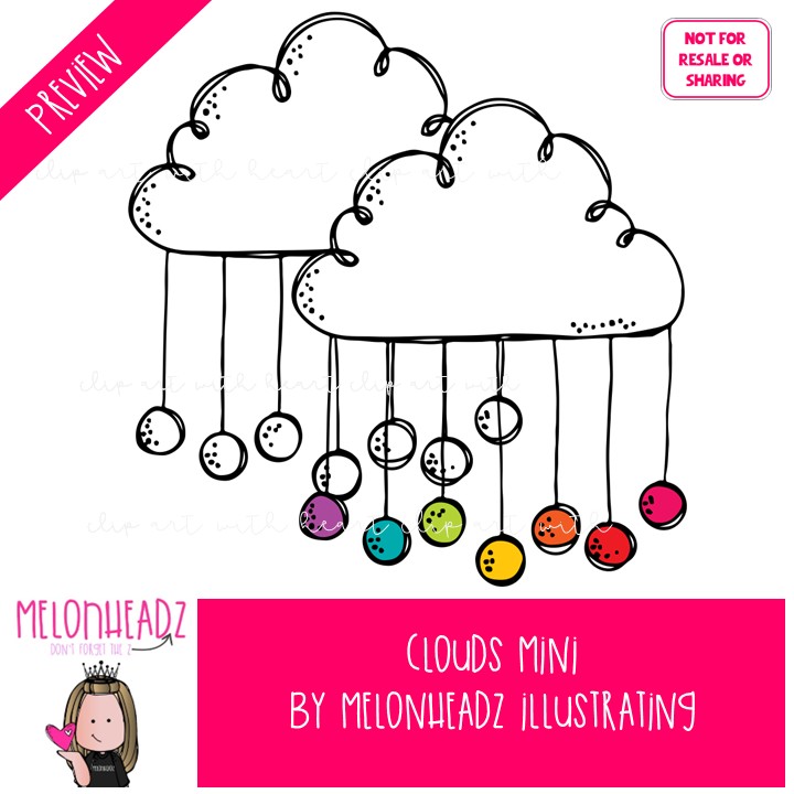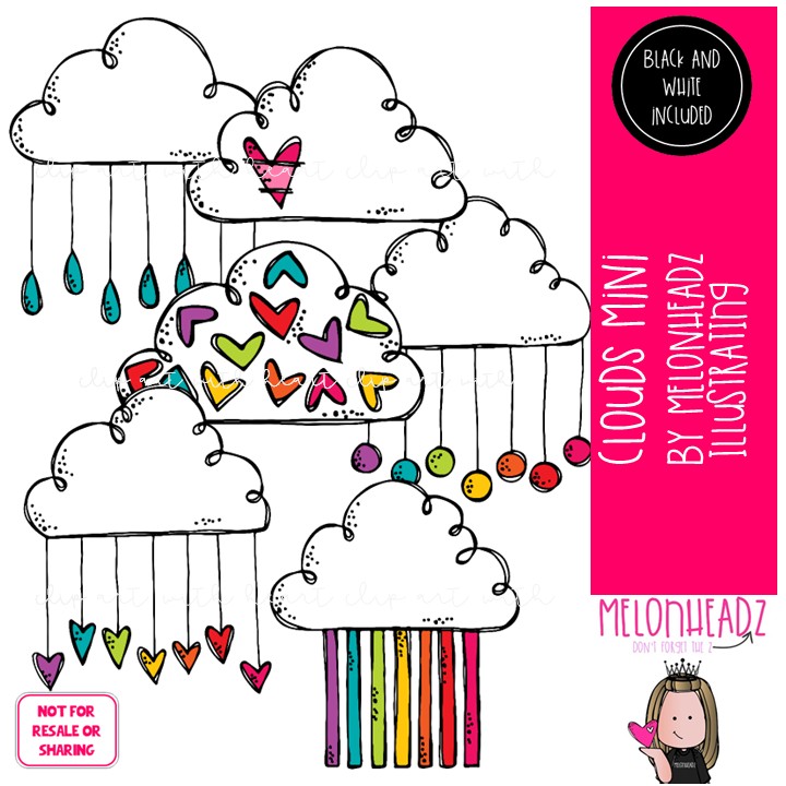 Clouds clip art, rainbow, weather Mini: This illustrated set contains all of the clip art images as shown in the preview picture. COLORED and BLACK AND WHITE illustrations included.