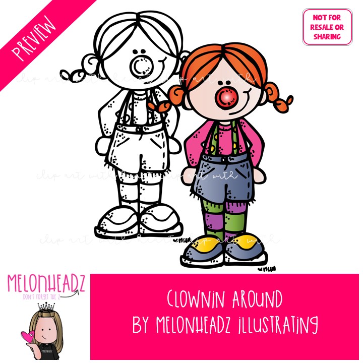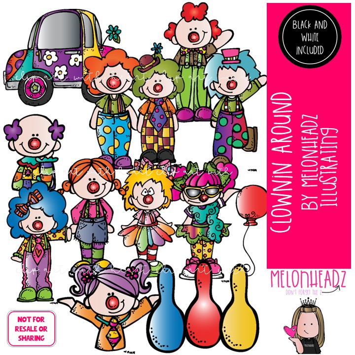 Clownin Around clip art, clowns, costume, circus COMBO PACK: This illustrated set contains all of the clip art images as shown in the preview picture. COLORED and BLACK AND WHITE illustrations included.