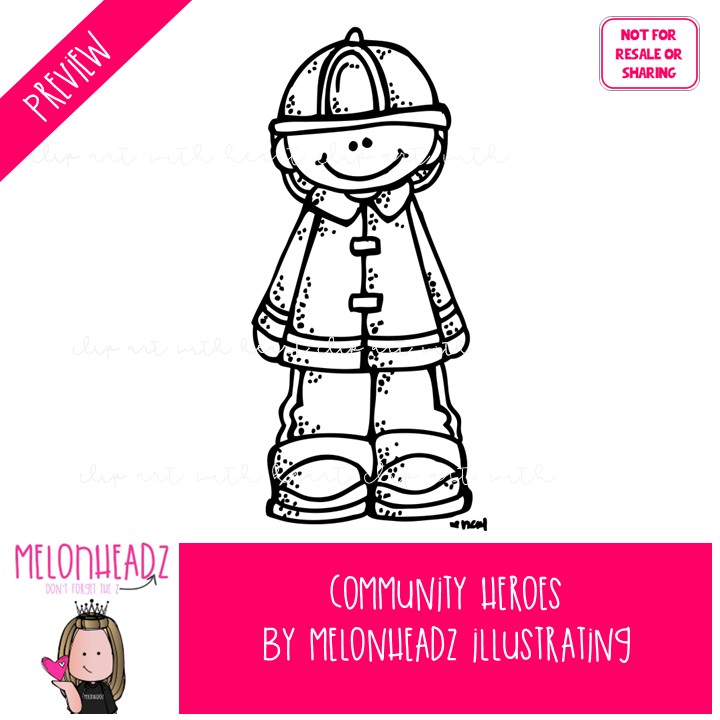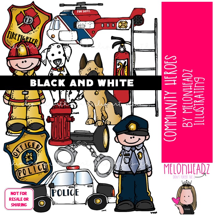 Community Heroes clip art, fireman, police officer BLACK AND WHITE: This illustrated set contains all of the clip art images as shown in the preview picture. BLACK AND WHITE illustrations included.