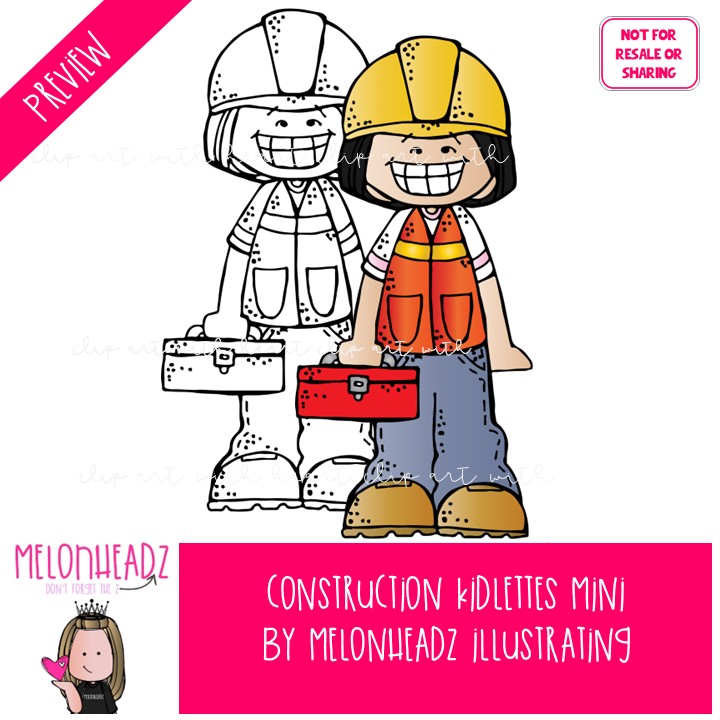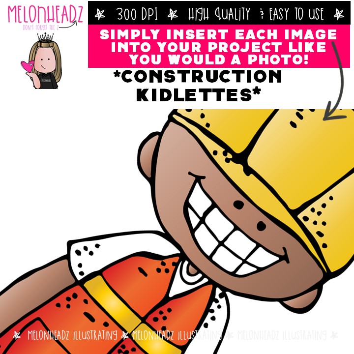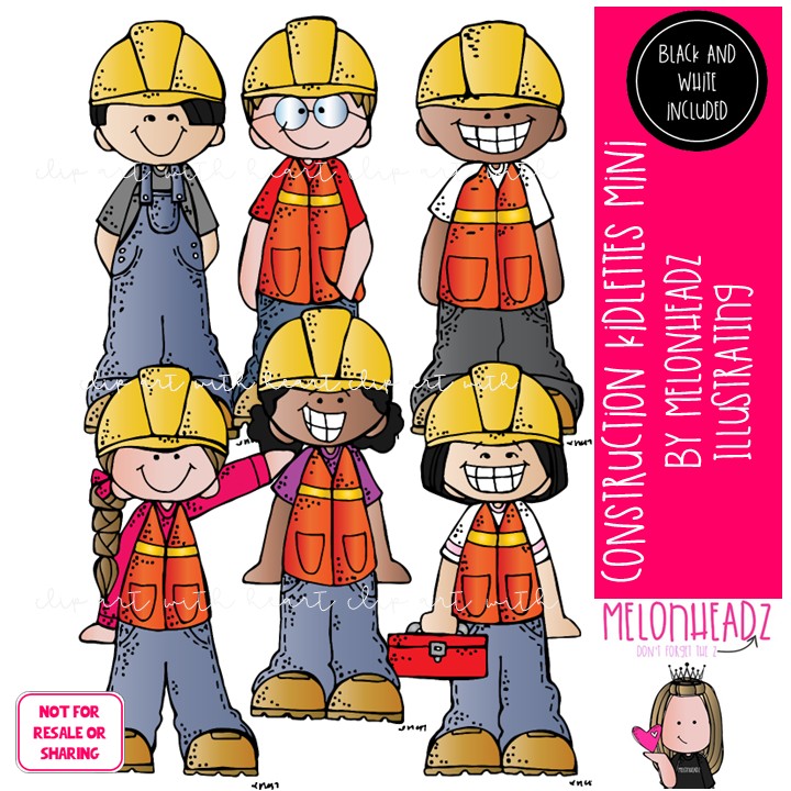 Construction Kidlettes clip art, career, hard hat Mini: This illustrated set contains all of the clip art images as shown in the preview picture. COLORED and BLACK AND WHITE illustrations included.