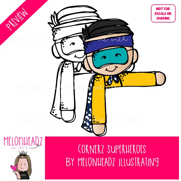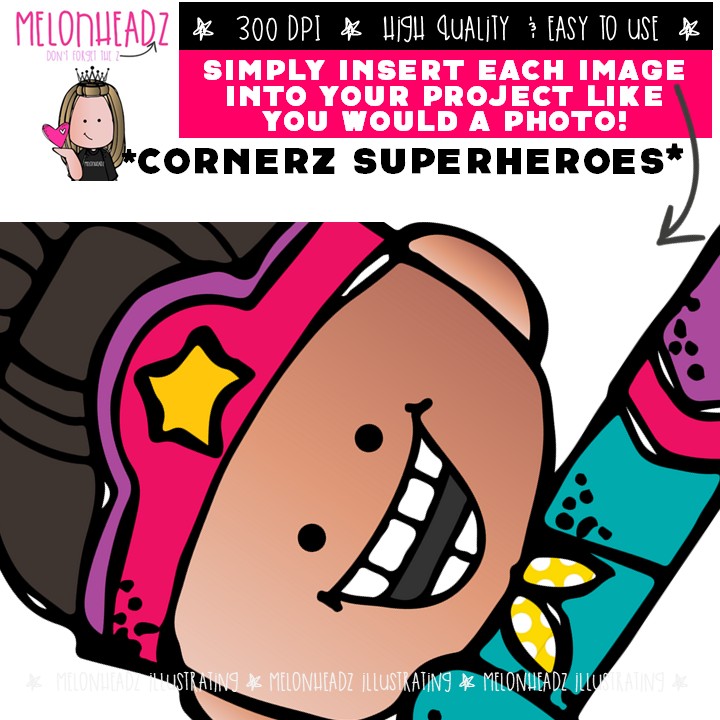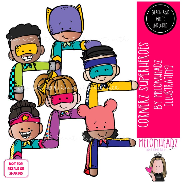 Cornerz clip art, Superhero, topper Mini: This illustrated set contains all of the clip art images as shown in the preview picture. COLORED and BLACK AND WHITE illustrations included.