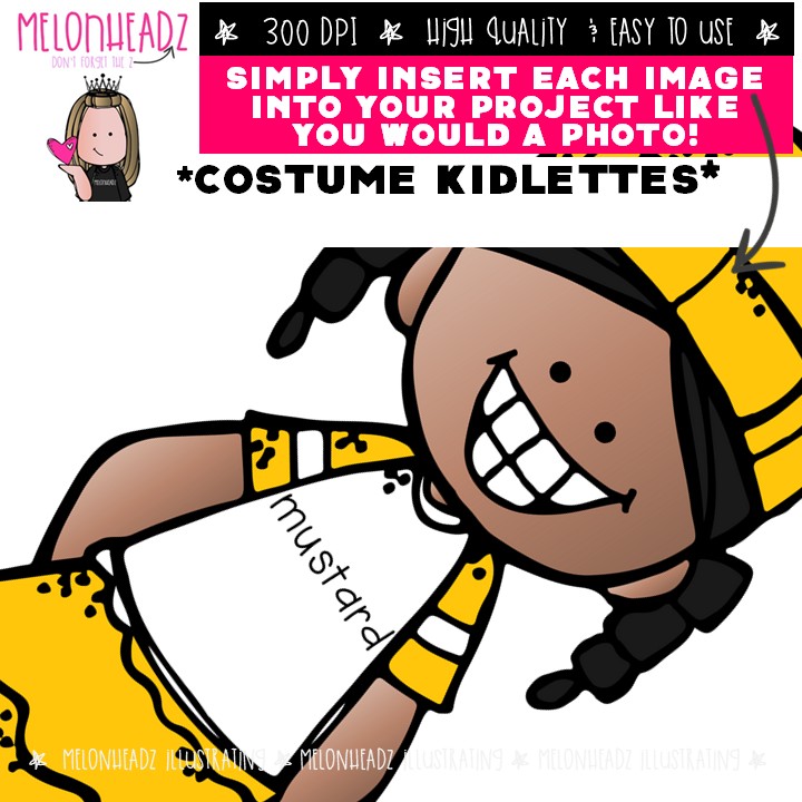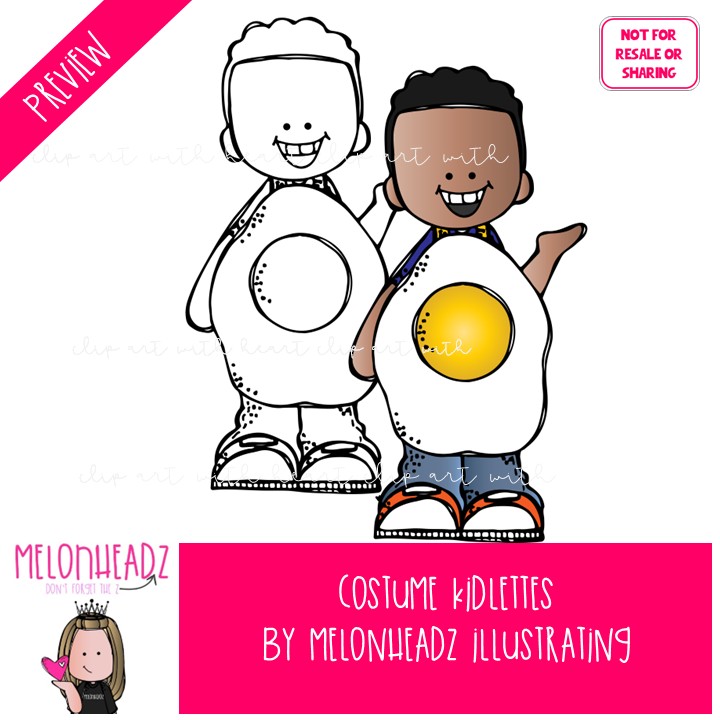 Costume Kidlettes clip art, Halloween, pairs COMBO PACK: This illustrated set contains all of the clip art images as shown in the preview picture. COLORED and BLACK AND WHITE illustrations included.