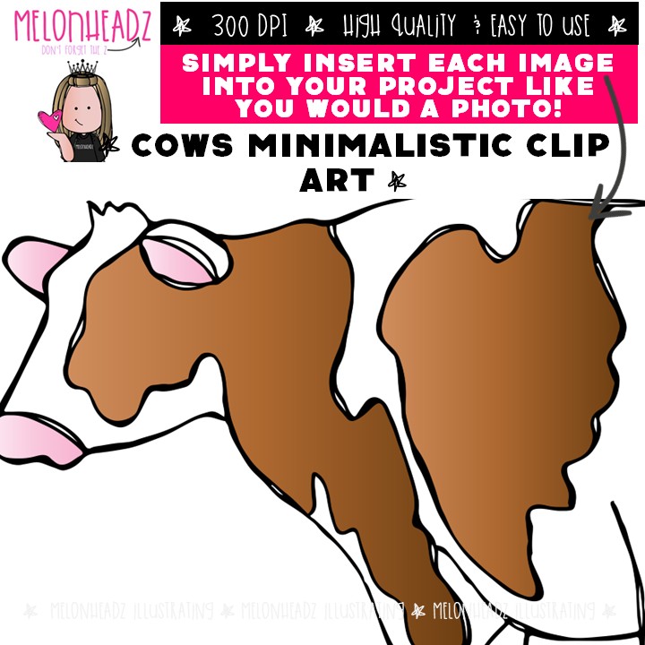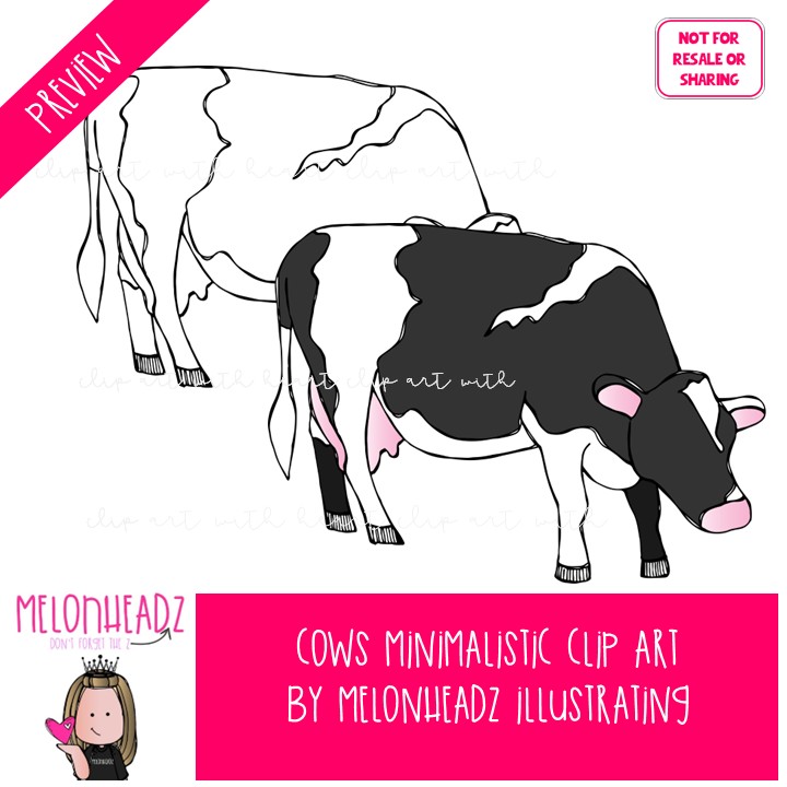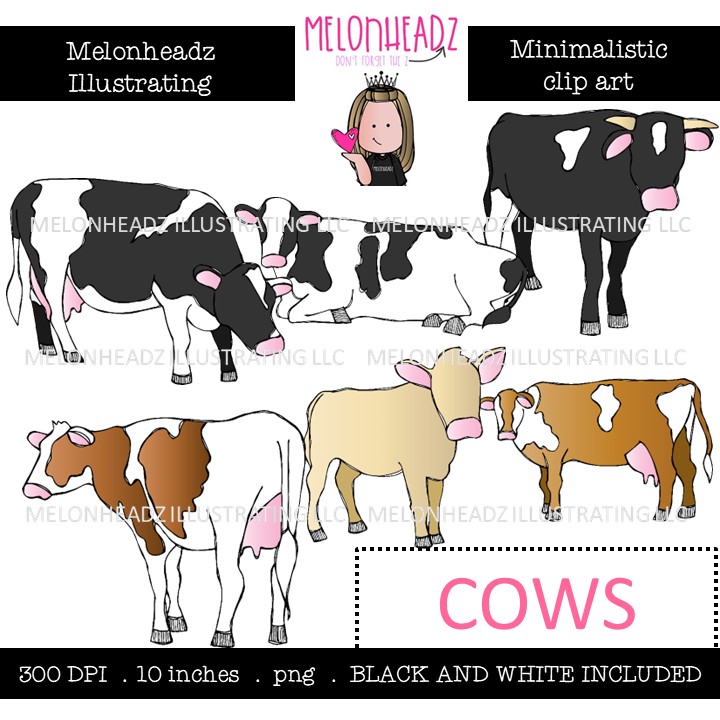 Cow clip art, Minimal Style Mini: This illustrated set contains all of the clip art images as shown in the preview picture. COLORED and BLACK AND WHITE illustrations included.
