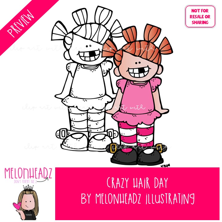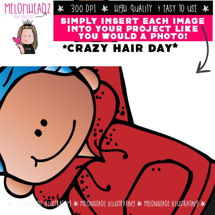 Crazy Hair Day clip art, School Spirit, Celebration COMBO PACK: This illustrated set contains all of the clip art images as shown in the preview picture. COLORED and BLACK AND WHITE illustrations included.