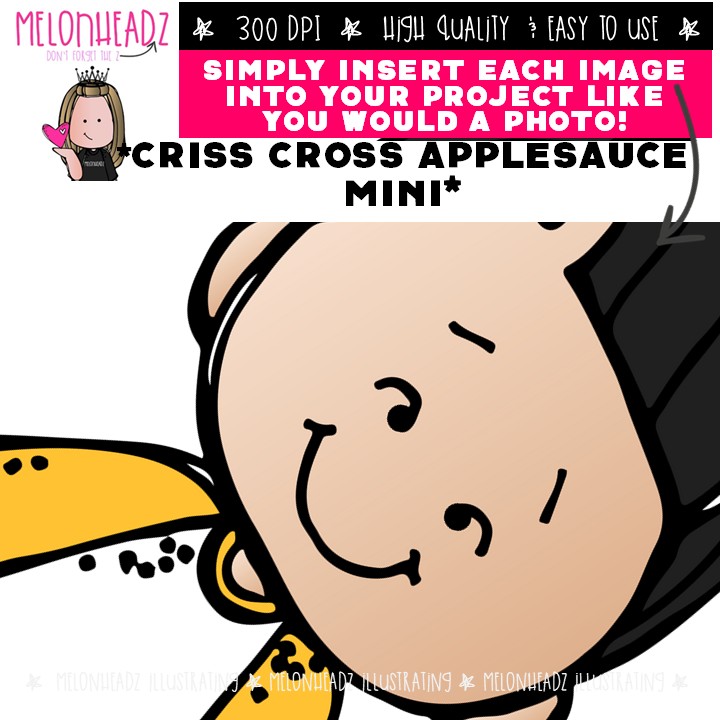 Criss Cross Applesauce 2 clip art, Cross Legged, Sitting Mini: This illustrated set contains all of the clip art images as shown in the preview picture. COLORED and BLACK AND WHITE illustrations included.