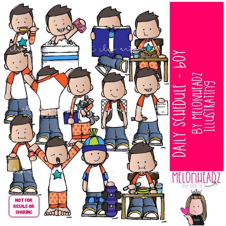 Daily Schedule clip art, boy, task, sequence COLORED Version: This illustrated set contains all of the clip art images as shown in the preview picture. COLORED illustrations included.