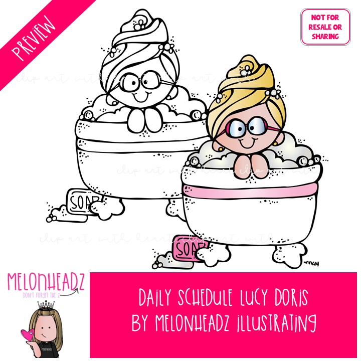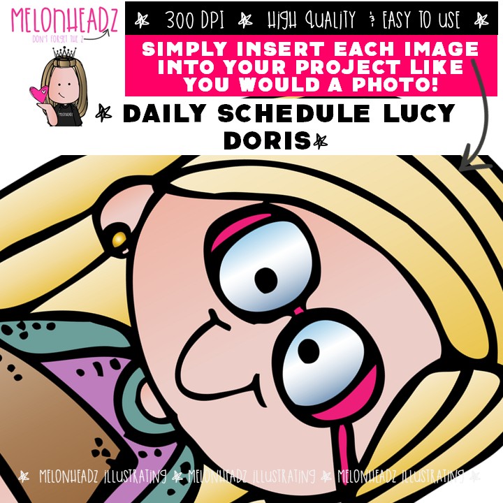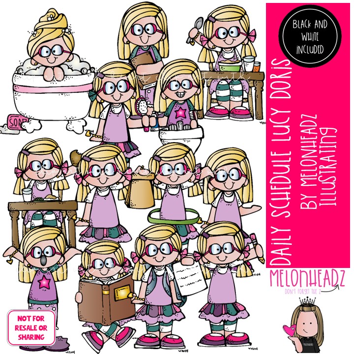 Daily Schedule clip art, Lucy Doris, Melonheadz Character COMBO PACK: This illustrated set contains all of the clip art images as shown in the preview picture. COLORED and BLACK AND WHITE illustrations included.