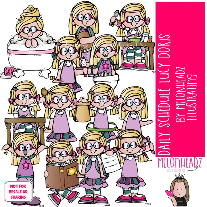 Daily Schedule clip art, Lucy Doris, Melonheadz Character COLORED Version: This illustrated set contains all of the clip art images as shown in the preview picture. COLORED illustrations included.