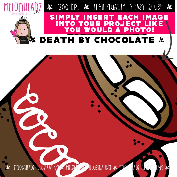 Death by Chocolate clip art, dessert, candy COLORED Version: This illustrated set contains all of the clip art images as shown in the preview picture. COLORED illustrations included.