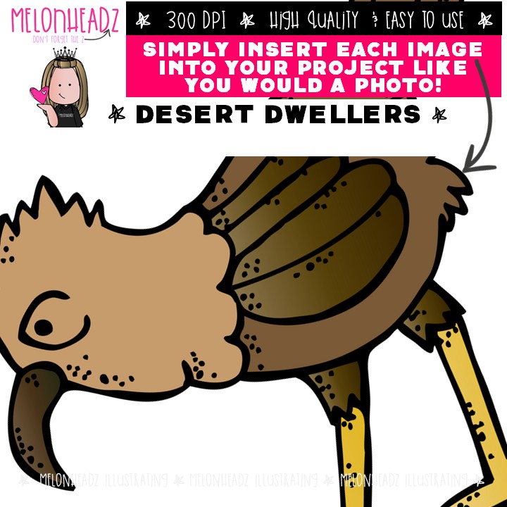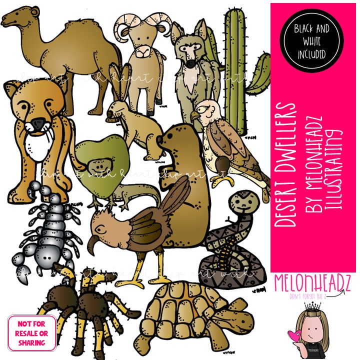 Desert Dweller Animals clip art, camel, scorpion COMBO PACK: This illustrated set contains all of the clip art images as shown in the preview picture. COLORED and BLACK AND WHITE illustrations included.