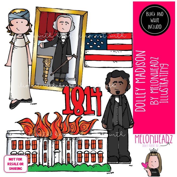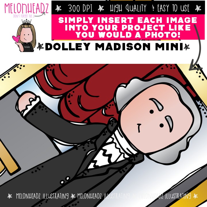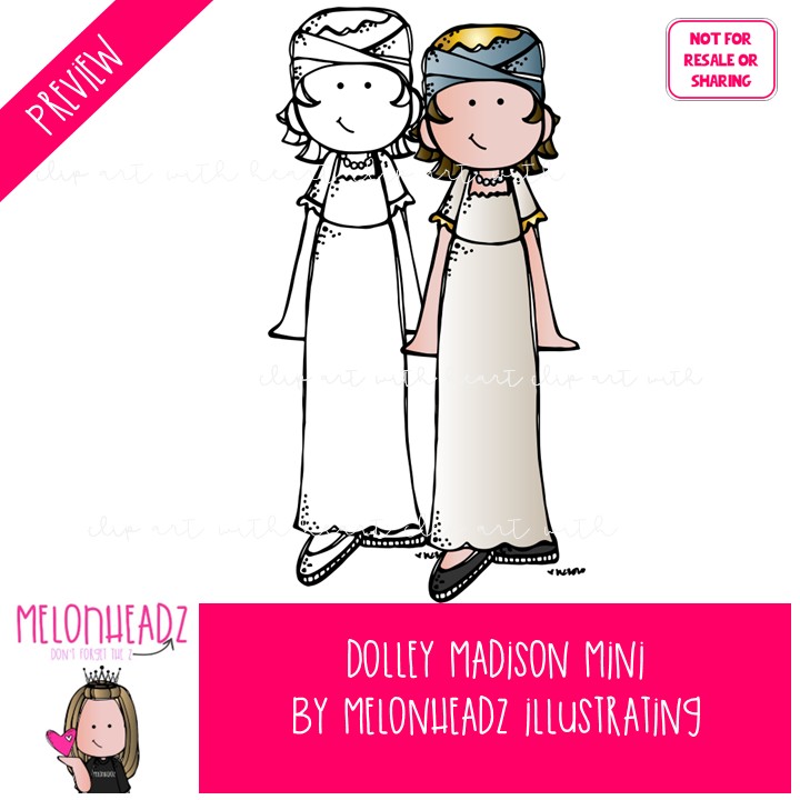 Dolley Madison clip art, Historical Figure Mini: This illustrated set contains all of the clip art images as shown in the preview picture. COLORED and BLACK AND WHITE illustrations included.
