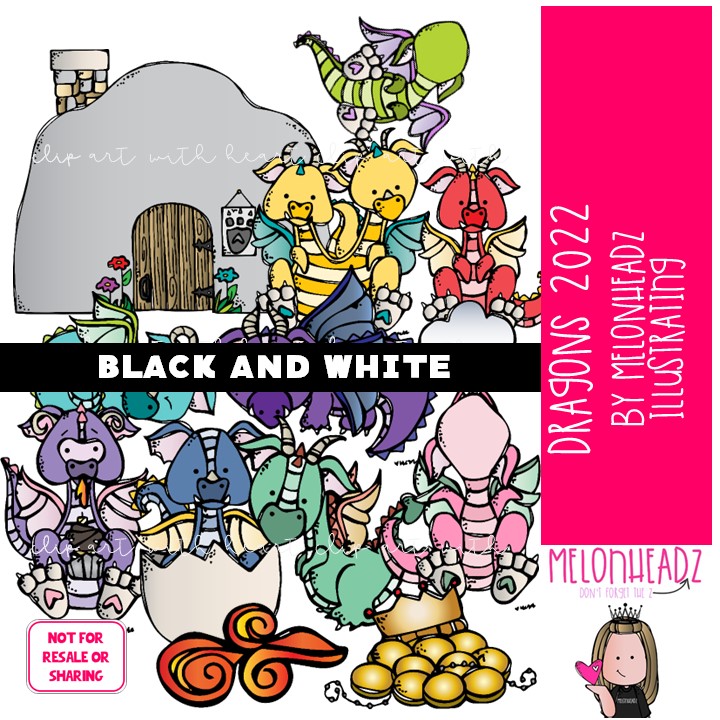 Dragons clip art 2022, cave, leviathan BLACK AND WHITE: This illustrated set contains all of the clip art images as shown in the preview picture. BLACK AND WHITE illustrations included.