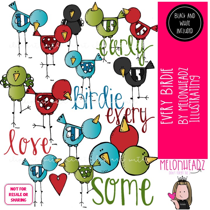 Every Birdie clip art, bird, fowl COMBO PACK: This illustrated set contains all of the clip art images as shown in the preview picture. COLORED and BLACK AND WHITE illustrations included.