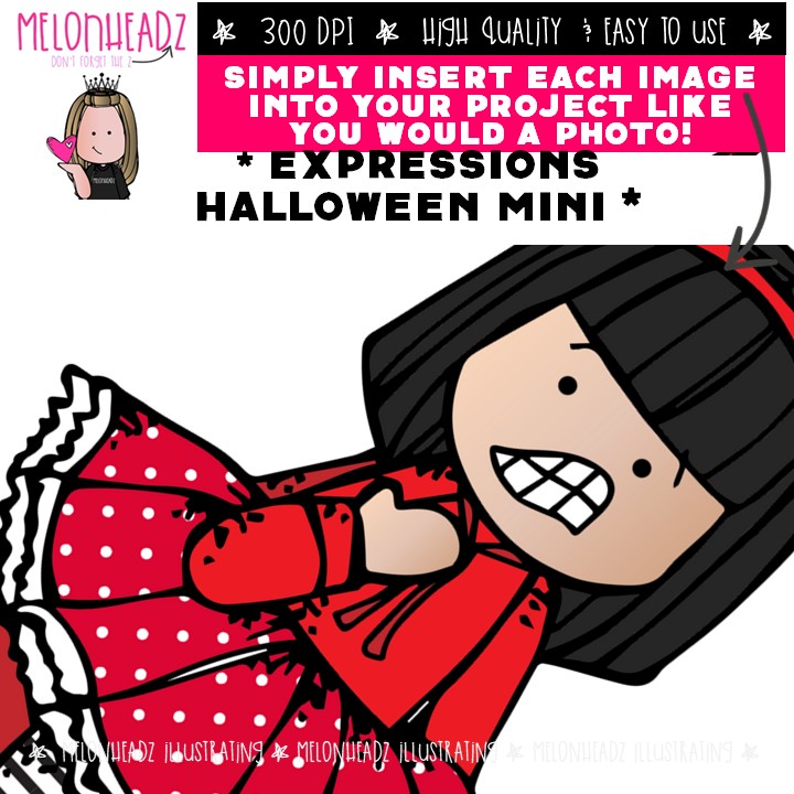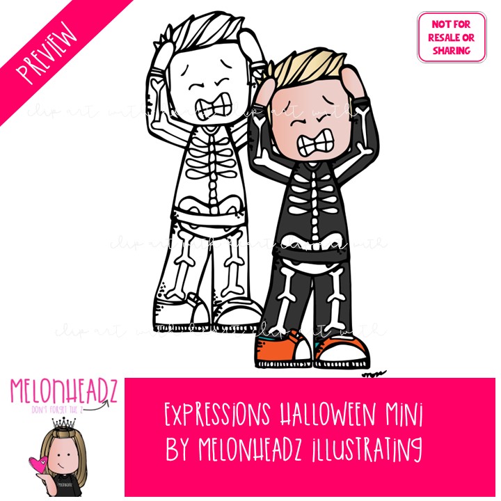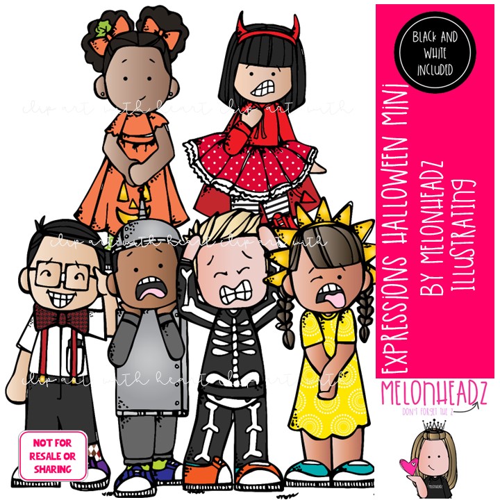 Expressions clip art, Halloween, costume, emotions: This illustrated set contains all of the clip art images as shown in the preview picture. COLORED and BLACK AND WHITE illustrations included.