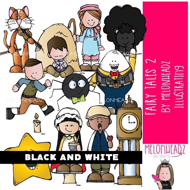 Fairy Tale clip art Set 2, Nursery Rhyme clip art, Literature clip art BLACK AND WHITE: This illustrated set contains all of the clip art images as shown in the preview picture. BLACK AND WHITE  illustrations included.
