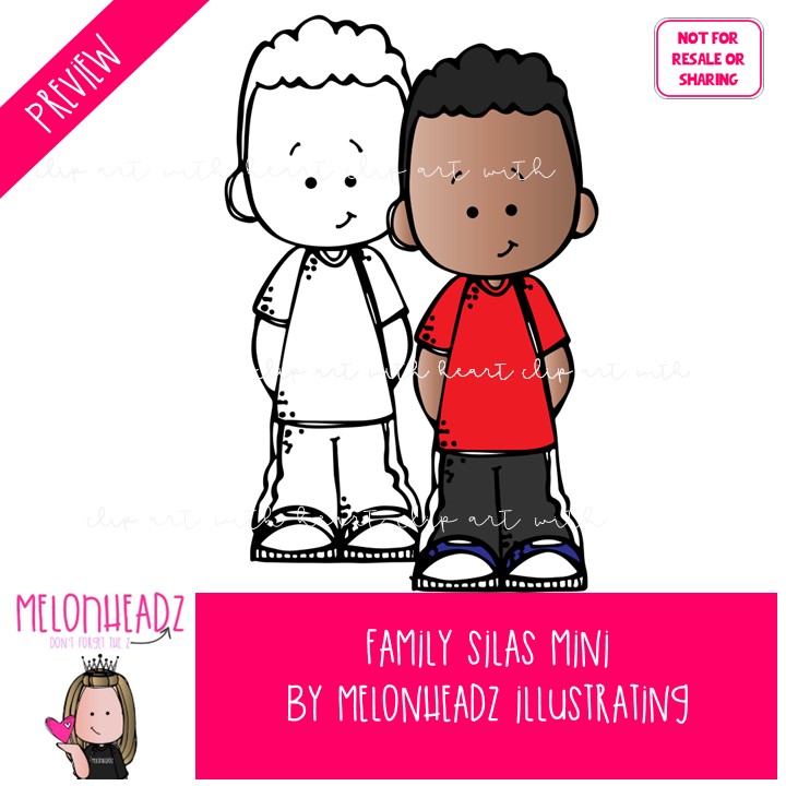 Family clip art, Silas, Melonheadz Character Mini: This illustrated set contains all of the clip art images as shown in the preview picture. COLORED and BLACK AND WHITE illustrations included.