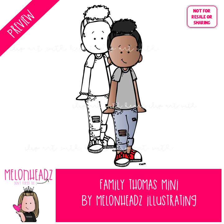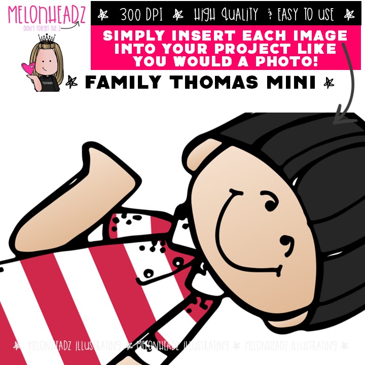 Family clip art, Thomas, Melonheadz Characters Mini: This illustrated set contains all of the clip art images as shown in the preview picture. COLORED and BLACK AND WHITE illustrations included.